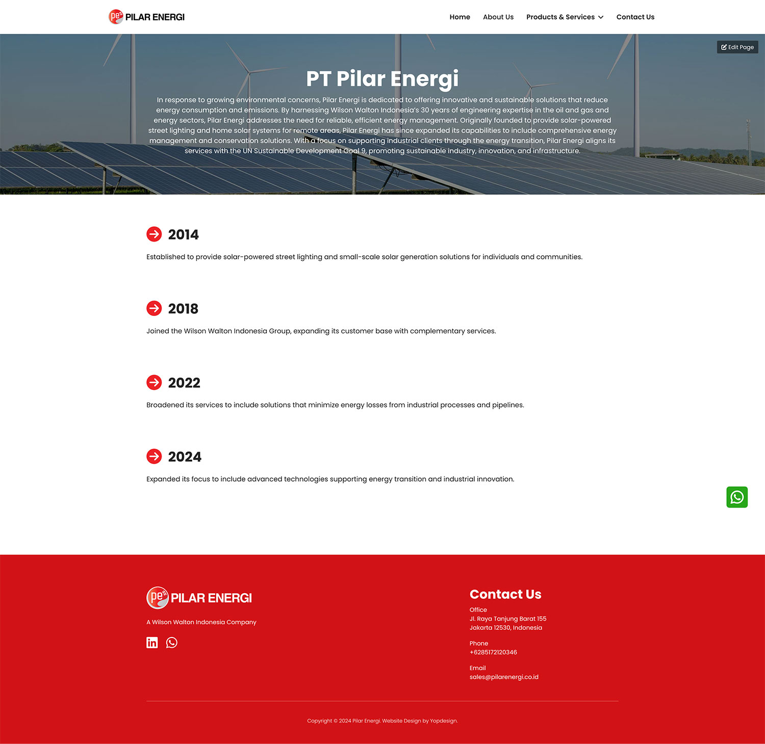 In response to growing environmental concerns, Pilar Energi is dedicated to offering innovative and sustainable solutions that reduce energy consumption and emissions. By harnessing Wilson Walton Indonesia’s 30 years of engineering expertise in the oil and gas and energy sectors, Pilar Energi addresses the need for reliable, efficient energy management. Originally founded to provide solar-powered street lighting and home solar systems for remote areas, Pilar Energi has since expanded its capabilities to include comprehensive energy management and conservation solutions. With a focus on supporting industrial clients through the energy transition, Pilar Energi aligns its services with the UN Sustainable Development Goal 9, promoting sustainable industry, innovation, and infrastructure.